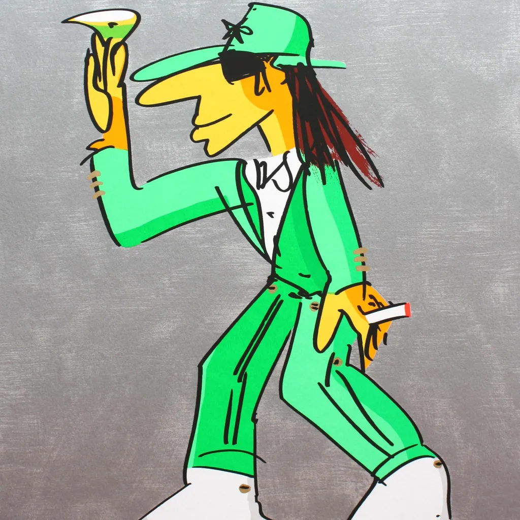 Künstler: Udo Lindenberg Titel: Coole Socke (2022) Blattgröße: 56 x 42 cm Technik: Siebdruck auf Büttenpapier Auflage: 250 Exemplare Handsigniert!Die Udo Lindenberg Seriegrafie "Coole Socke" ist eine limitierte Serigraphie, die aufgrund der hohen Nachfrage nach Udo Lindenbergs Aquarellen entstanden ist. Das Kunstwerk zeigt eine farbenfrohe Illustration von Udo mit einer langen Nase und einem Hut, der ein Getränk in der Hand hält. Das Selbstbildnis trägt einen blauen Anzug und gelbe Schuhe. Der Hintergrund ist silbergrau mit gelben und orangefarbenen Spritzern. Der Text "Coole Socke" ist in schwarzer Schrift am unteren linken Rand des Bildes geschrieben die gesamte Auflage beträgt 250 Exemplare die alle von Udo Lindenberg handsigniert wurden.
