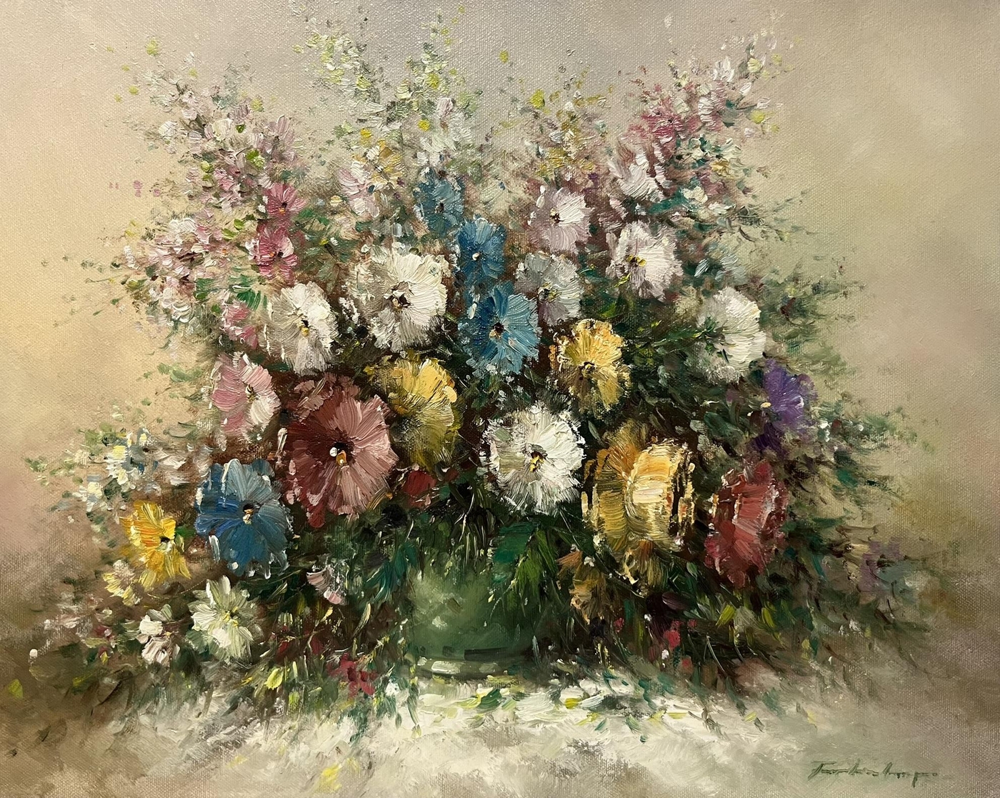 "Blumenstrauss" ist ein prächtiges Stillleben von Fürstenberger, das einen atemberaubenden Blütenstrauß in einer beeindruckenden Farbbrillanz darstellt. Die Intensität und Tiefe der Ölfarben verleihen dem Kunstwerk eine lebendige und fast dreidimensionale Wirkung. Dieses detaillierte und sorgfältige Meisterwerk, ergänzt jede Sammlung und strahlt eine warme und beruhigende Aura aus.