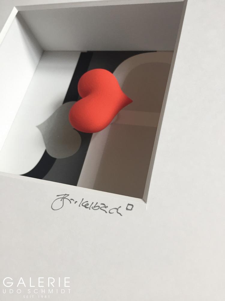 Das 3-D Objekt ist mit Passepartout in einer schwarzen Holzleiste mit Glas gerahmt.