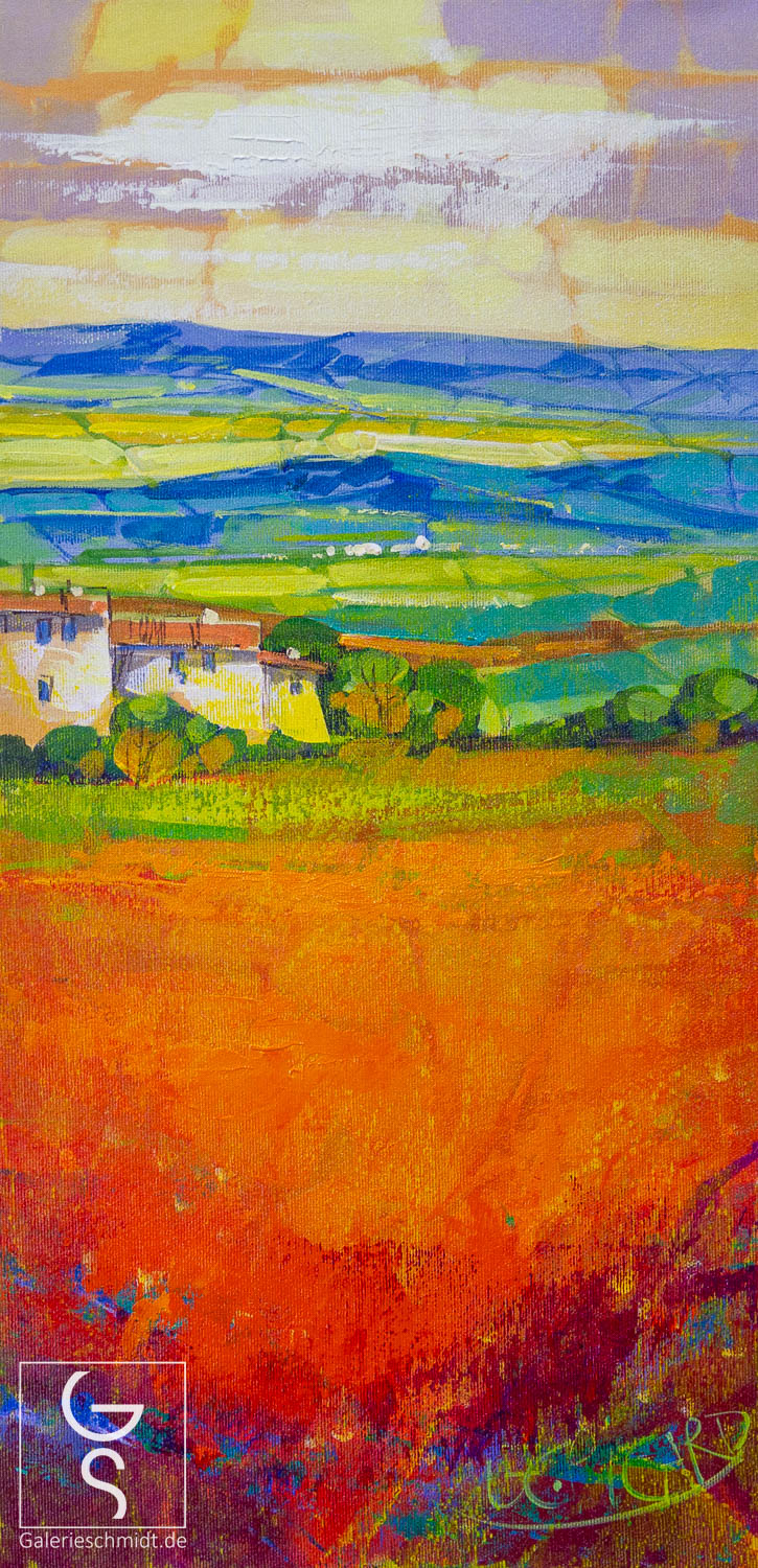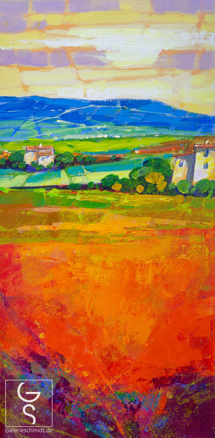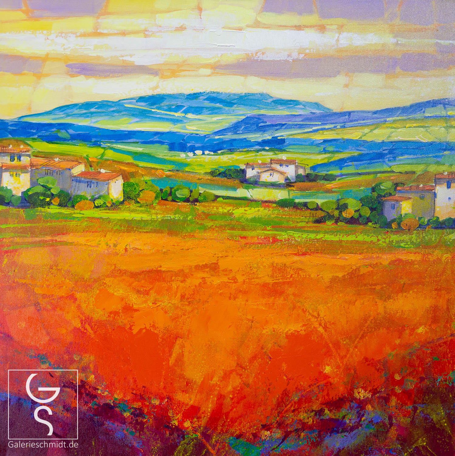 Jean-Claude Picard, der "Maler des südlichen Lichtes", präsentiert ein beeindruckendes Triptychon, das die lebendige Schönheit eines rot und orange blühenden Feldes einfängt. Im Hintergrund erheben sich majestätische blaue Berge, die von einem leuchtenden Sonnenaufgang überstrahlt werden. Inmitten dieser malerischen Szenerie stehen vereinzelt Häuser mit charakteristischen terracottafarbenen Dächern, die dem Bild eine besondere Tiefe und Wärme verleihen. Dieses Kunstwerk ist ein Zeugnis von Picards Fähigkeit, die Essenz mediterraner Landschaften und Kulturen einzufangen und auf der Leinwand festzuhalten.