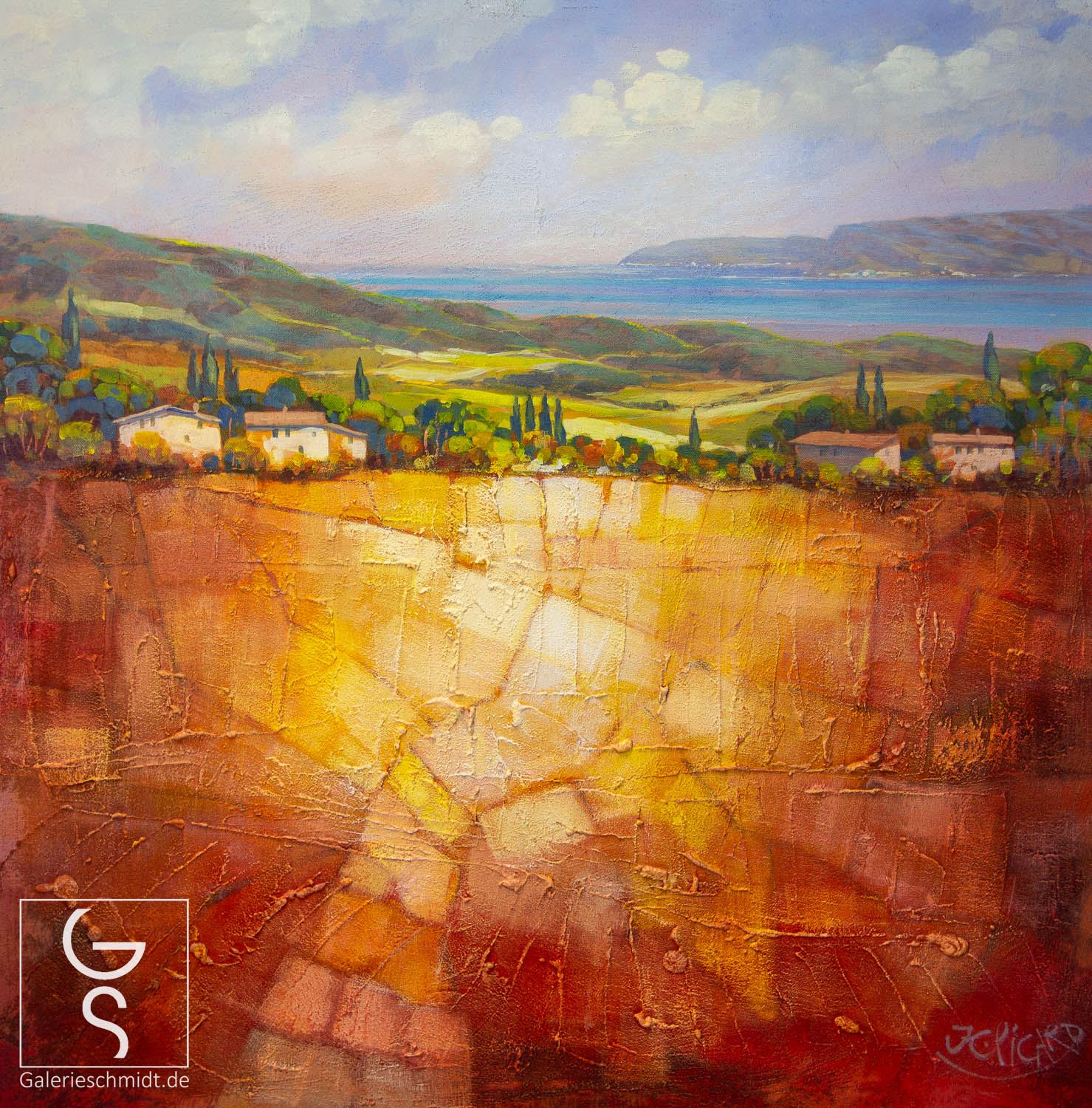 Jean-Claude Picard, der "Maler des südlichen Lichtes", präsentiert ein beeindruckendes Kunstwerk, das die lebendige Schönheit eines sonnenbeleuchteten Feldes einfängt. Das Feld leuchtet in prächtigen Farben, die von warmen Orange- und Brauntönen bis zu sanften Goldtönen reichen. Am Horizont erstreckt sich das ruhige, blaue Meer, das einen beruhigenden Kontrast zur lebendigen Landschaft bietet. Dieses Gemälde ist ein Zeugnis von Picards Fähigkeit, die Essenz mediterraner Landschaften und Kulturen einzufangen und auf der Leinwand festzuhalten.