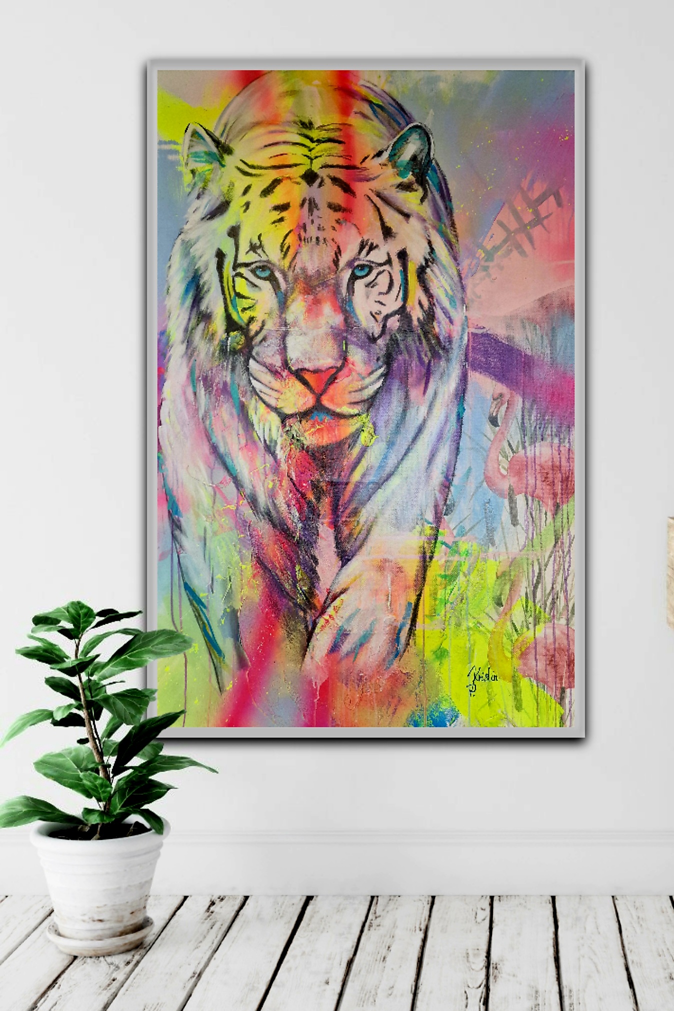 Kristin Preugschats "Tiger" ist ein eindrucksvolles Gemälde, das die wilde Schönheit und das majestätische Wesen eines Tigers in einem Strudel leuchtender Farben einfängt. Dieses Stück nutzt UV-reaktive Farben, die unter Schwarzlicht leuchten, um eine fesselnde Optik zu schaffen, die sich bei unterschiedlichen Lichtverhältnissen wandelt und den Betrachter immer wieder aufs Neue überrascht.